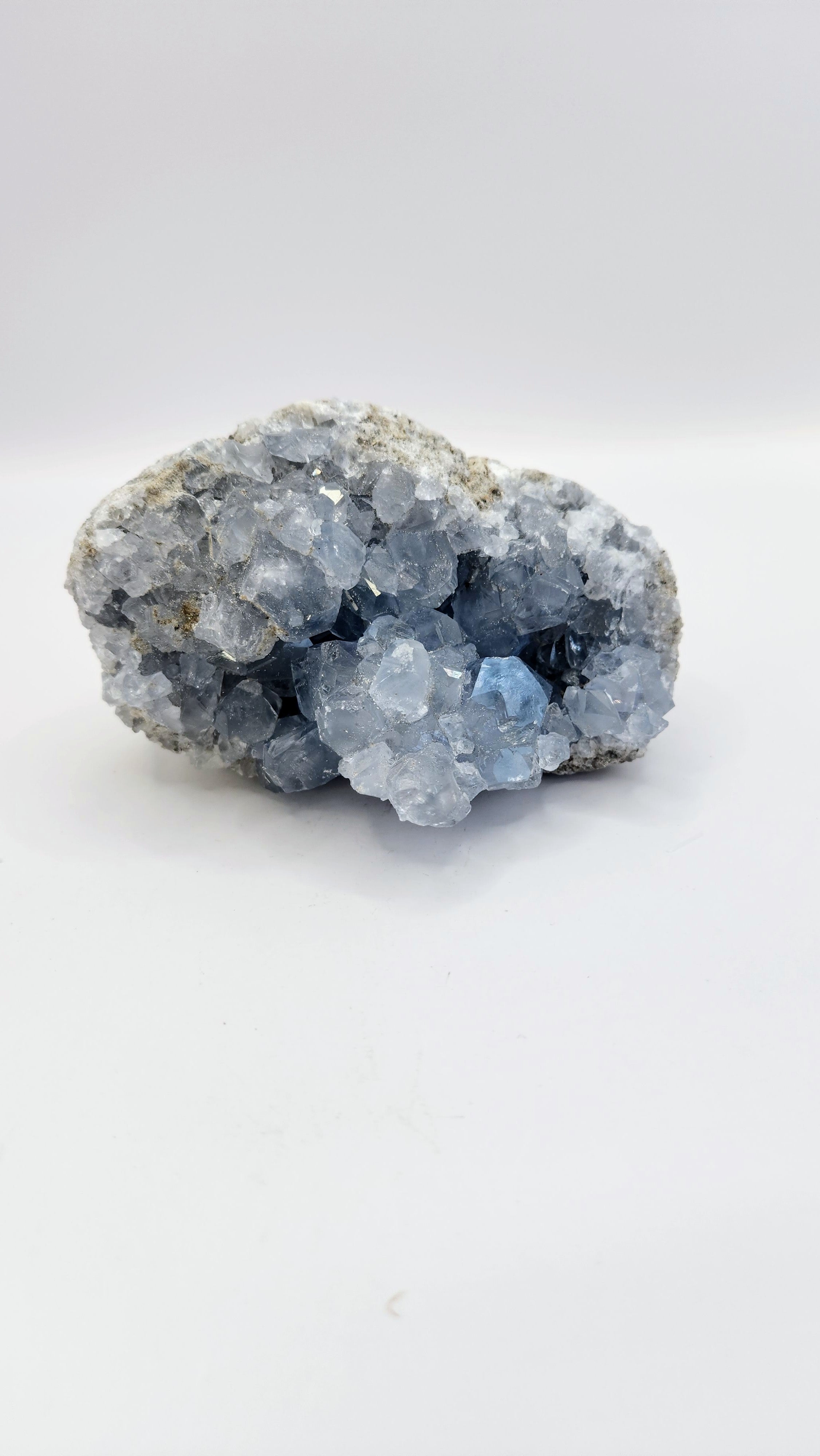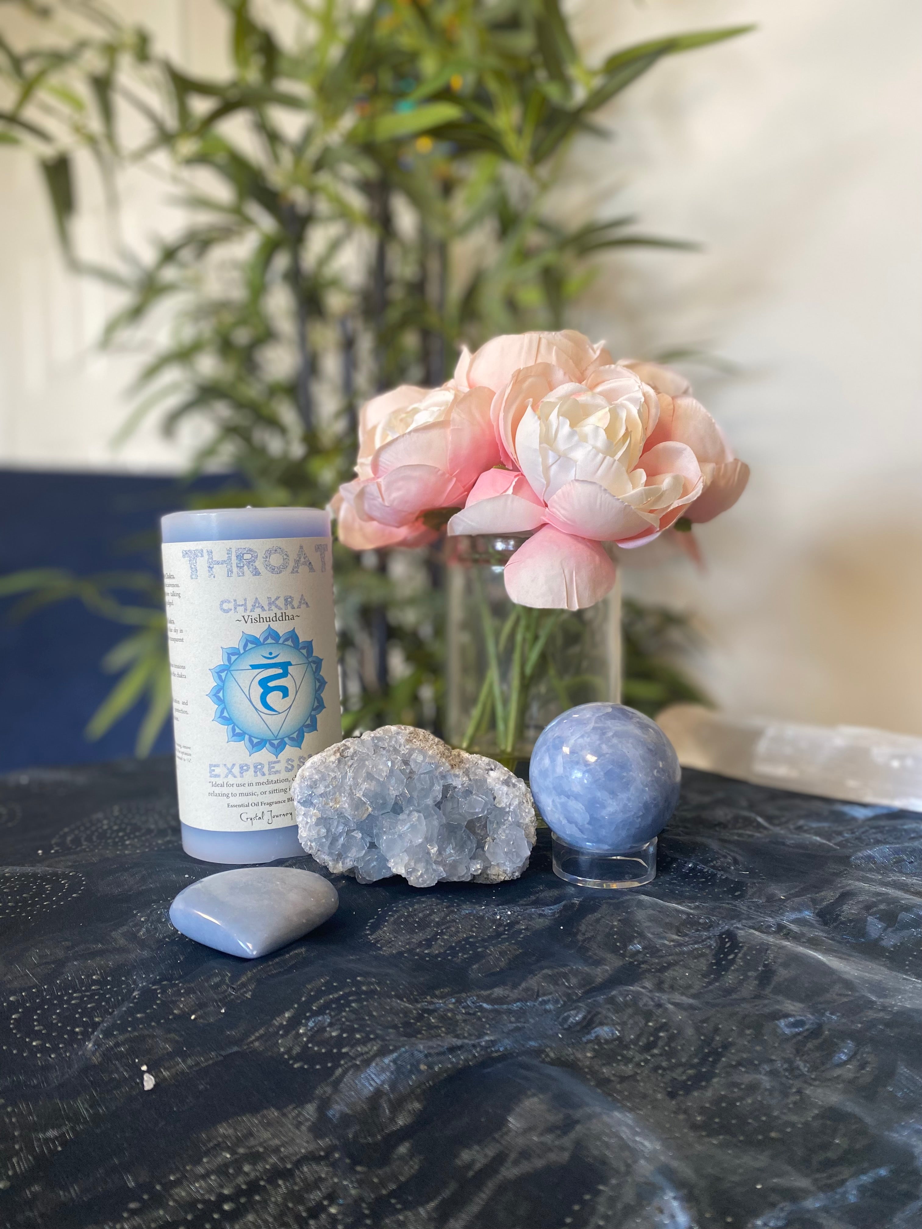Blue Calcite is associated with the Third Eye and Throat Chakras and is known to harmonize both your emotional and mental bodies. It is a great stone to place in your living or working environment as it helps to clear negative energy. Blue Celcite must be cleansed periodically. Water of any kind can damage your crystal. I suggested you use Sage, Palo Santo, or Selenite.