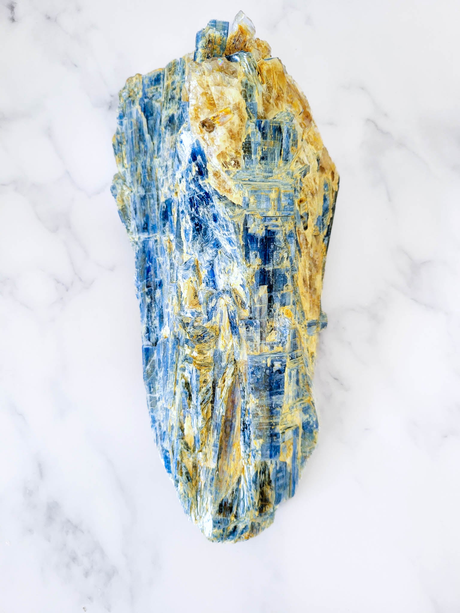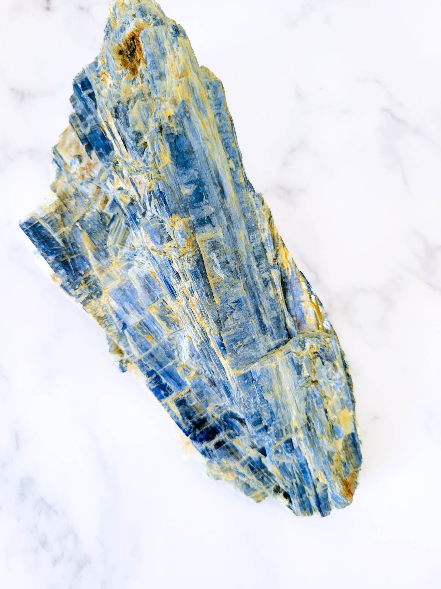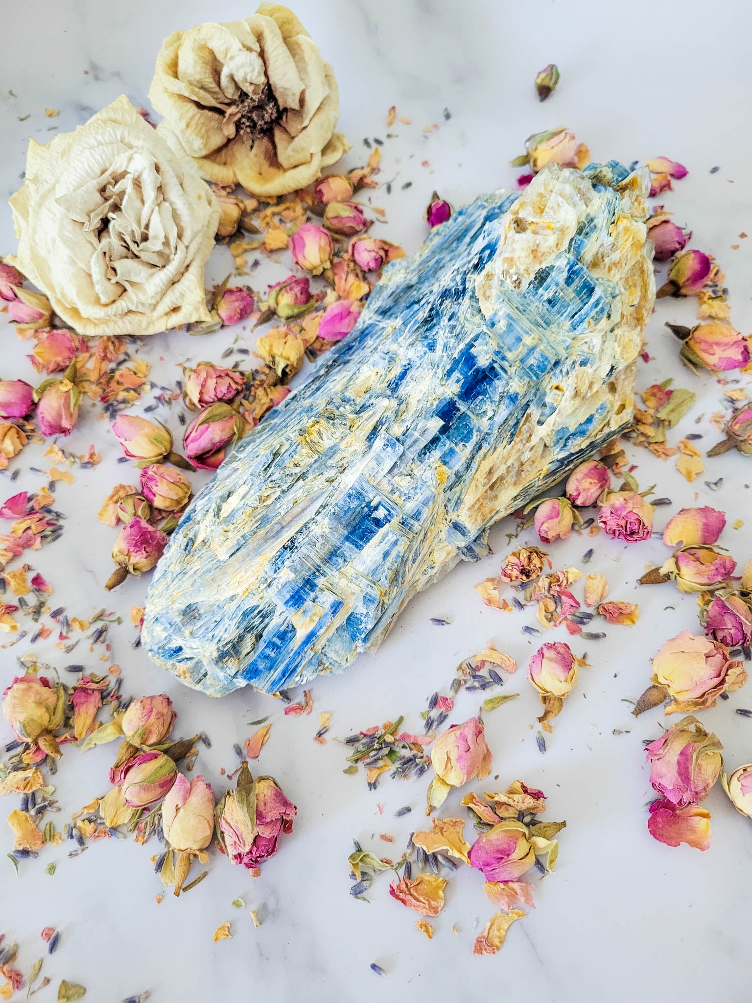 Raw Blue Kyanite is, first and foremost, a stone of communication. It is associated with the Throat Chakra and, as such, is a stone that will help you speak your authentic truth. Blue Kyanite encourages spiritual growth and will work with you to connect to Angelic realms.