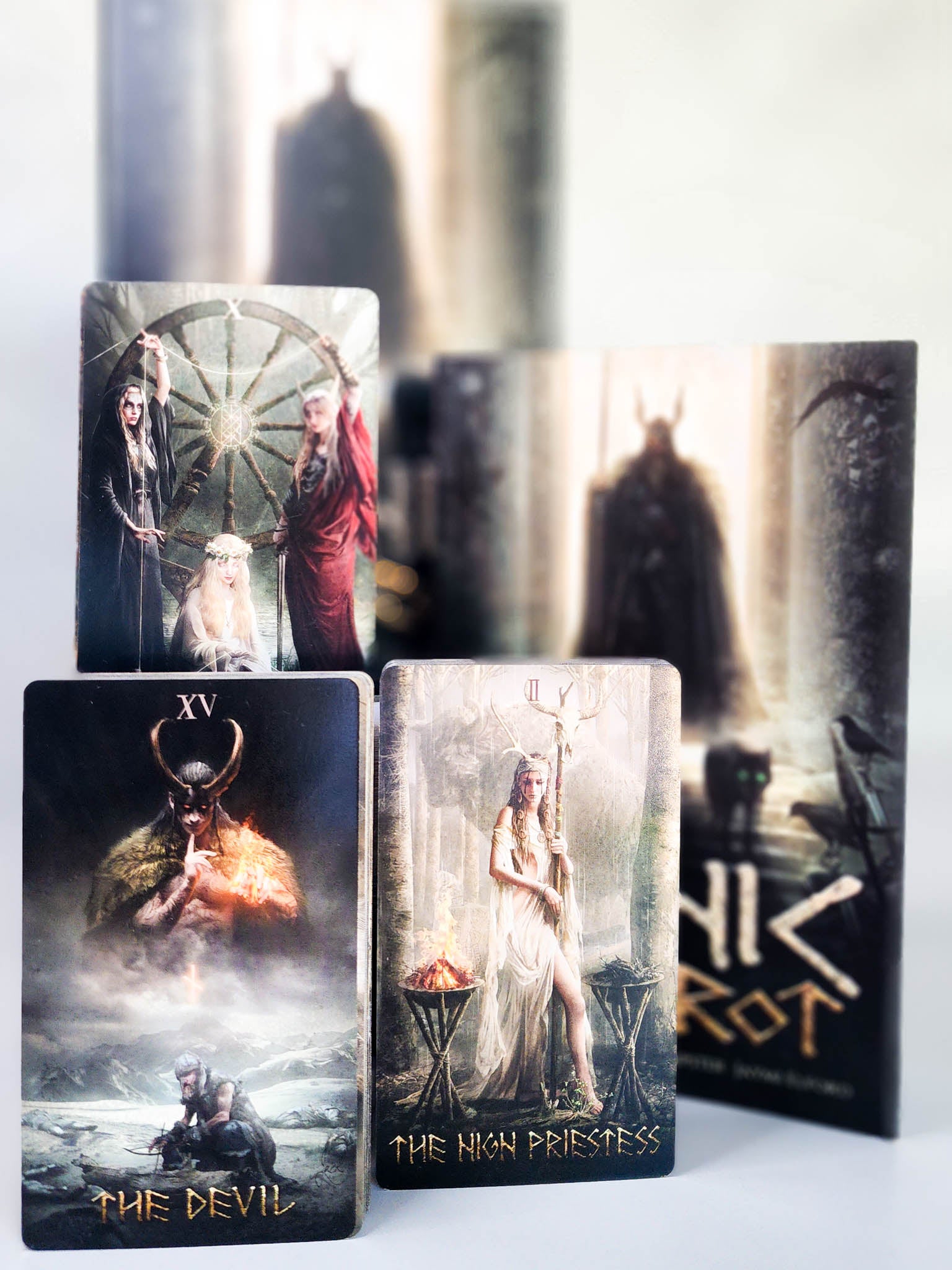 Norse mythology meets tarot in the coveted Runic Tarot Deck. Based on the gods and mythology of the Norse, the Runic Tarot is the ultimate divination deck for connecting with Valhalla, the realm of the gods. The powerful art is imbued with a fierce, ancient aura as it weaves together the wisdom of the runes, the poetry of the Skalds, the valor of the Einherjars, and the evergreen bounty of life and nature.