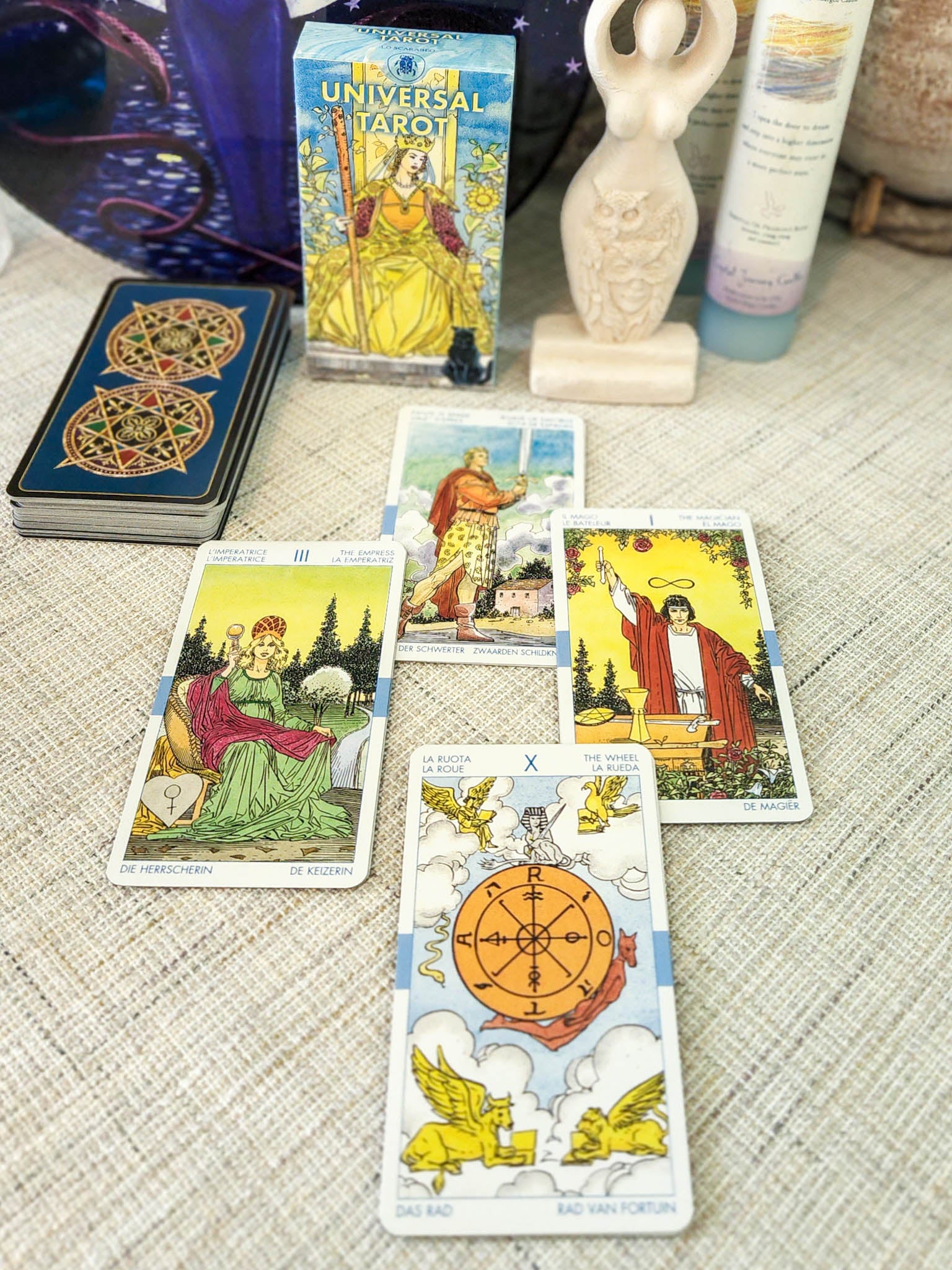 Universal Tarot is a depiction of the more traditional Rider-Waite Tarot deck. This style of Tarot card is traditionally the Tarot used for beginner Tarot readers. The imagery and symbolism used to convey the deeper meaning of each Tarot card are critical to the overall understanding of the deck and the ability to see the deeper meaning of the reading.